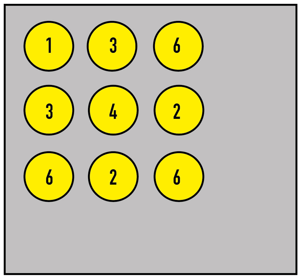 Keine Zeit für Gefühle – ihr war klar, dass hier etwas nicht mit rechten Dingen vor sich ging. Neugierig schaute sie in die restlichen Fächer und entdeckte einen Zettel mit 9 Zahlen in Kreisen. Handschriftlich war ein Vermerk auf dem Papier: „Verbinde alle Kreise mit nur 4 geraden Strichen (horizontal/vertikal/diagonal), ohne den Stift abzusetzen. Beginnt bei einer der Sechsen in der Ecke! Das Quadrat darf dabei nicht verlassen werden“.