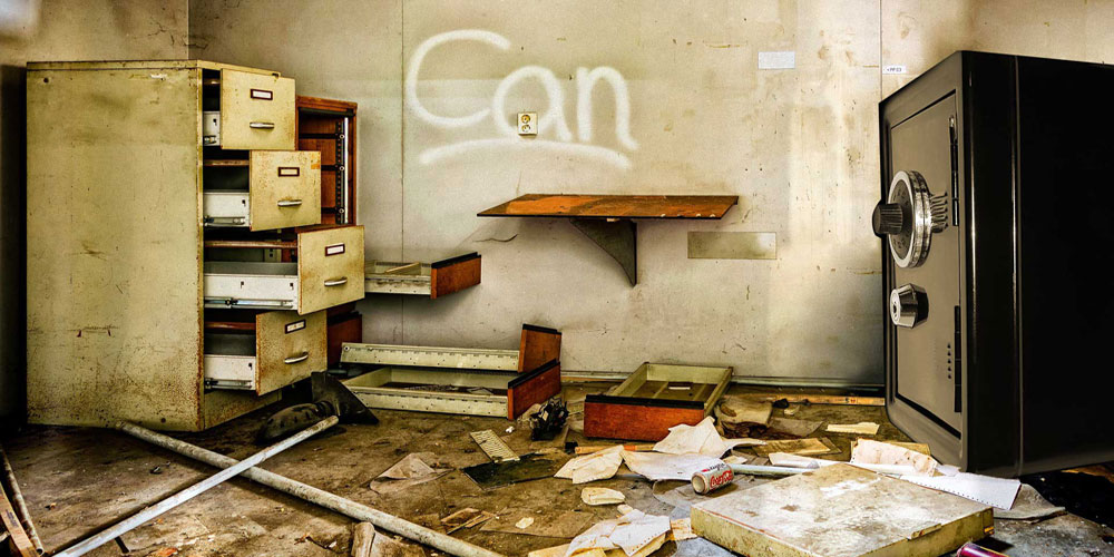 Mit leichten Ekelgefühlen durchschritt Sabrina den Türrahmen, der sich links von ihr befand. Eine Tür war nicht mehr vorhanden. In dem dahinterliegenden, sehr verwüsteten Raum fand sie eine Stahltür mit großen Zahlen, einen Tresor und einen Aktenschrank.